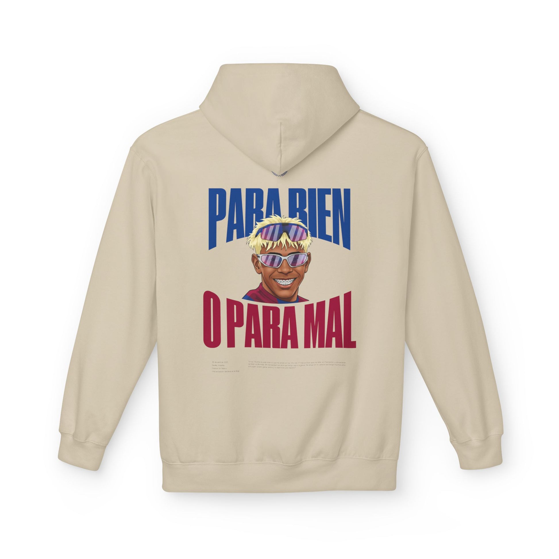 Este hoodie es una pieza que nace de una frase simple, directa y cargada de significado: “para bien o para mal”. Una expresión que resume el peso de las expectativas, la exposición temprana y la valentía de asumir el protagonismo sin esconderse. Habla de crecer bajo la mirada de todos, de aceptar el error y el acierto con la misma entereza, y de entender que el camino hacia algo grande nunca es cómodo ni perfecto. Un concepto que representa identidad, carácter y la decisión de seguir adelante pase lo que pase.