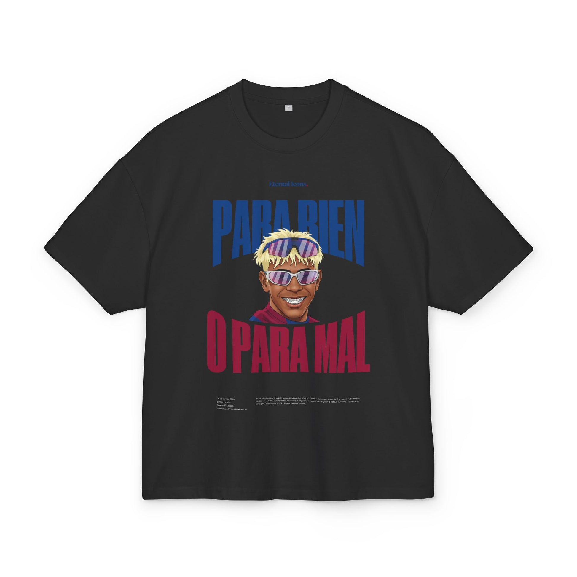 Esta camiseta es una pieza que nace de una frase simple, directa y cargada de significado: “para bien o para mal”. Una expresión que resume el peso de las expectativas, la exposición temprana y la valentía de asumir el protagonismo sin esconderse. Habla de crecer bajo la mirada de todos, de aceptar el error y el acierto con la misma entereza, y de entender que el camino hacia algo grande nunca es cómodo ni perfecto. Un concepto que representa identidad, carácter y la decisión de seguir adelante pase lo que pase.