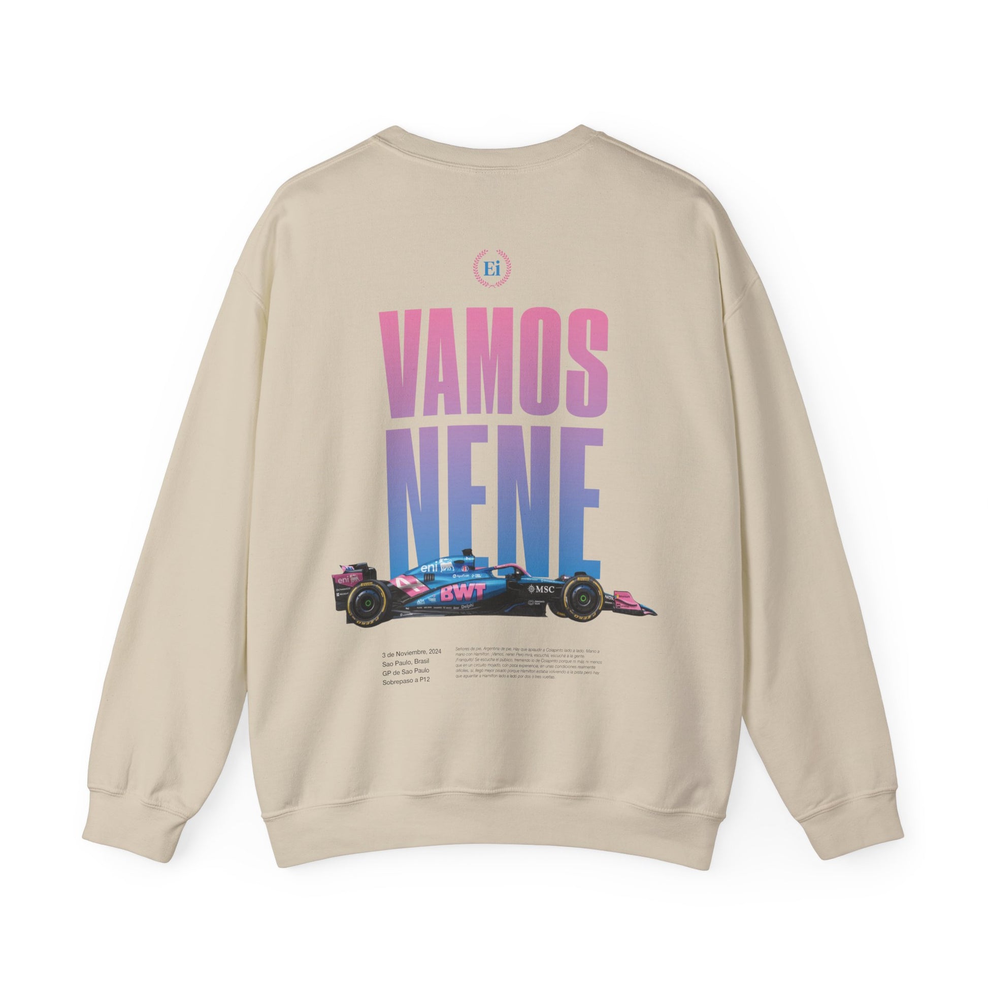 Esta sudadera rinde homenaje a uno de los momentos más intensos y celebrados del automovilismo reciente: un adelantamiento bajo una lluvia implacable, donde el talento, la valentía y la pasión se alinearon en una sola maniobra. Fue ese instante en el que un grito espontáneo “¡Vamos nene!” estalló con fuerza y quedó grabado en la memoria de miles de aficionados. Un recordatorio de que la emoción del deporte nace exactamente ahí: en los segundos en los que todo puede cambiar.